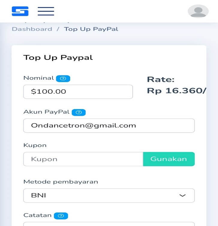 Klik kembali ikon garis tiga yang berada di pojok kiri atas, klik Dashboard dan pilih Top Up PayPal. kemudian akan muncul formulir pembelian.