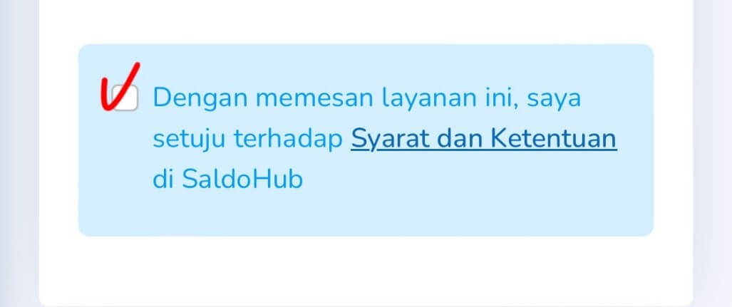 Jika sudah, cek kembali untuk memastikan apakah setiap kolomnya sudah terisi dengan benar. Jika sudah terisi dengan benar, ceklis kolom yang ada dibawah catatan yang menyatakan bahwa anda setuju dengan syarat dan ketentuan yang berlaku di SaldoHub.