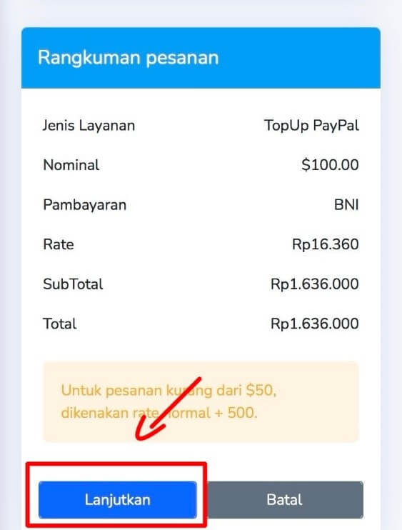 Scroll ke bagian paling bawah kemudian klik lanjutkan untuk melanjutkan proses pembayaran.